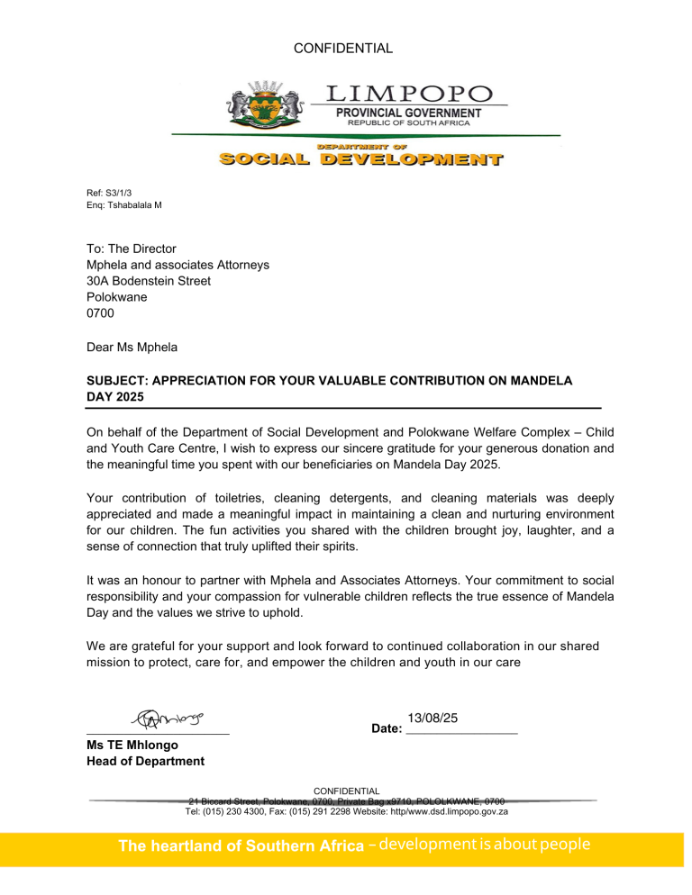 We are deeply honoured to have received an official letter of appreciation from the Department of Social Development, Limpopo, following our Mandela Day 2025 activities at the Polokwane Welfare Complex – Child and Youth Care Centre.