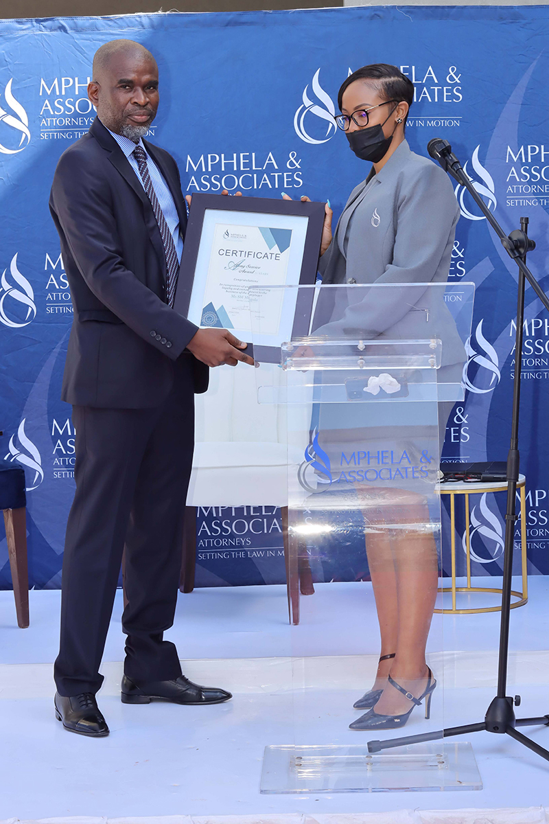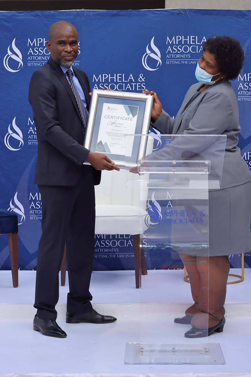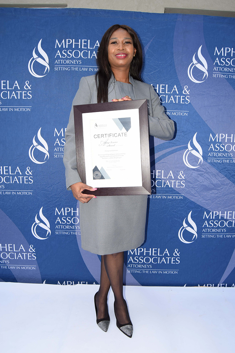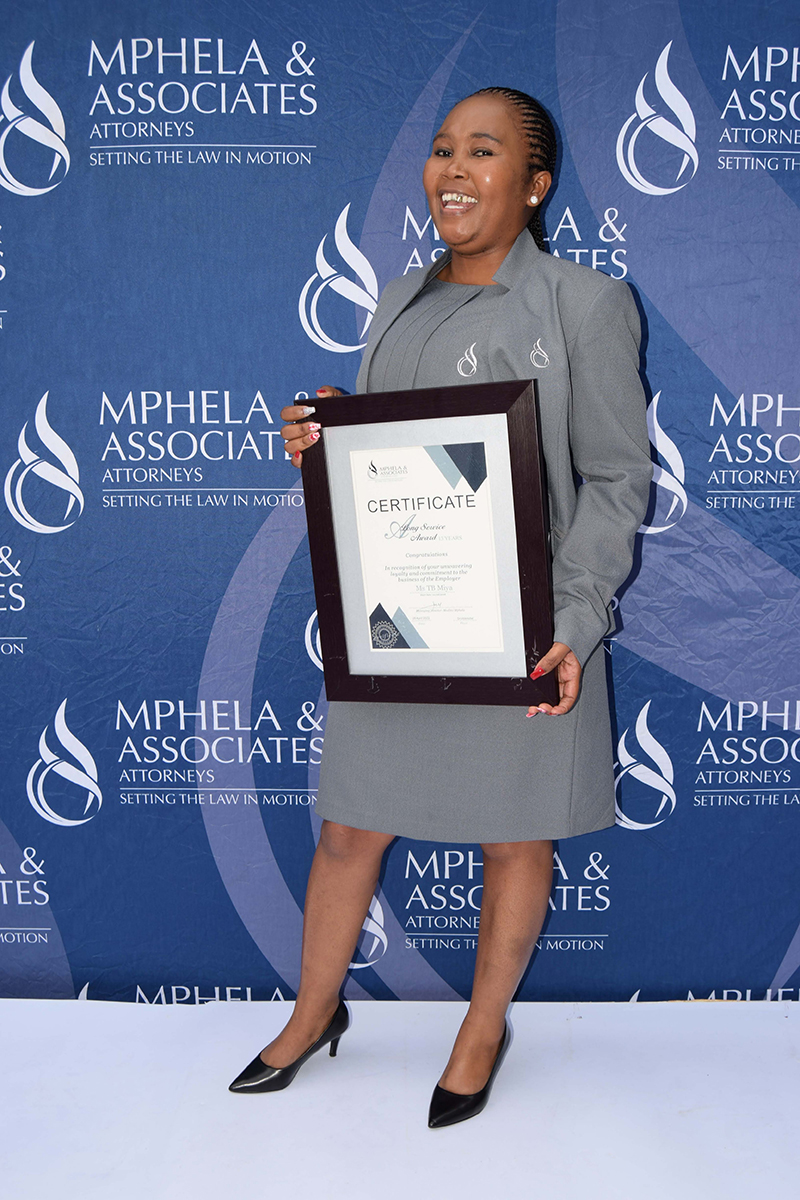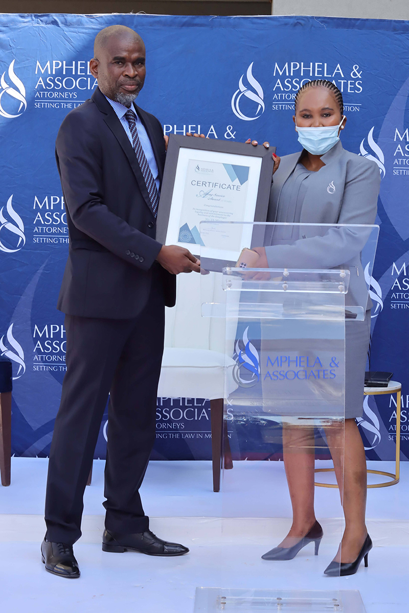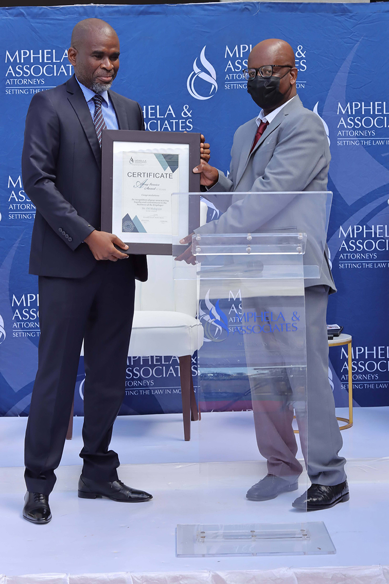 It is the dedication and commitment of our employees that drive the success behind Mphela and Associates Attorneys. On the 20th May 2022, we hosted an award ceremony to honour and celebrate twelve of our employees who have been with us for more than 10 years. The awards were presented by our Director, Mr Tshepho Matlala .The Managing Director, Mr Maditsi Mphela gave a keynote address. We look forward to your continued service & many more years of delivering the best service to our customers.